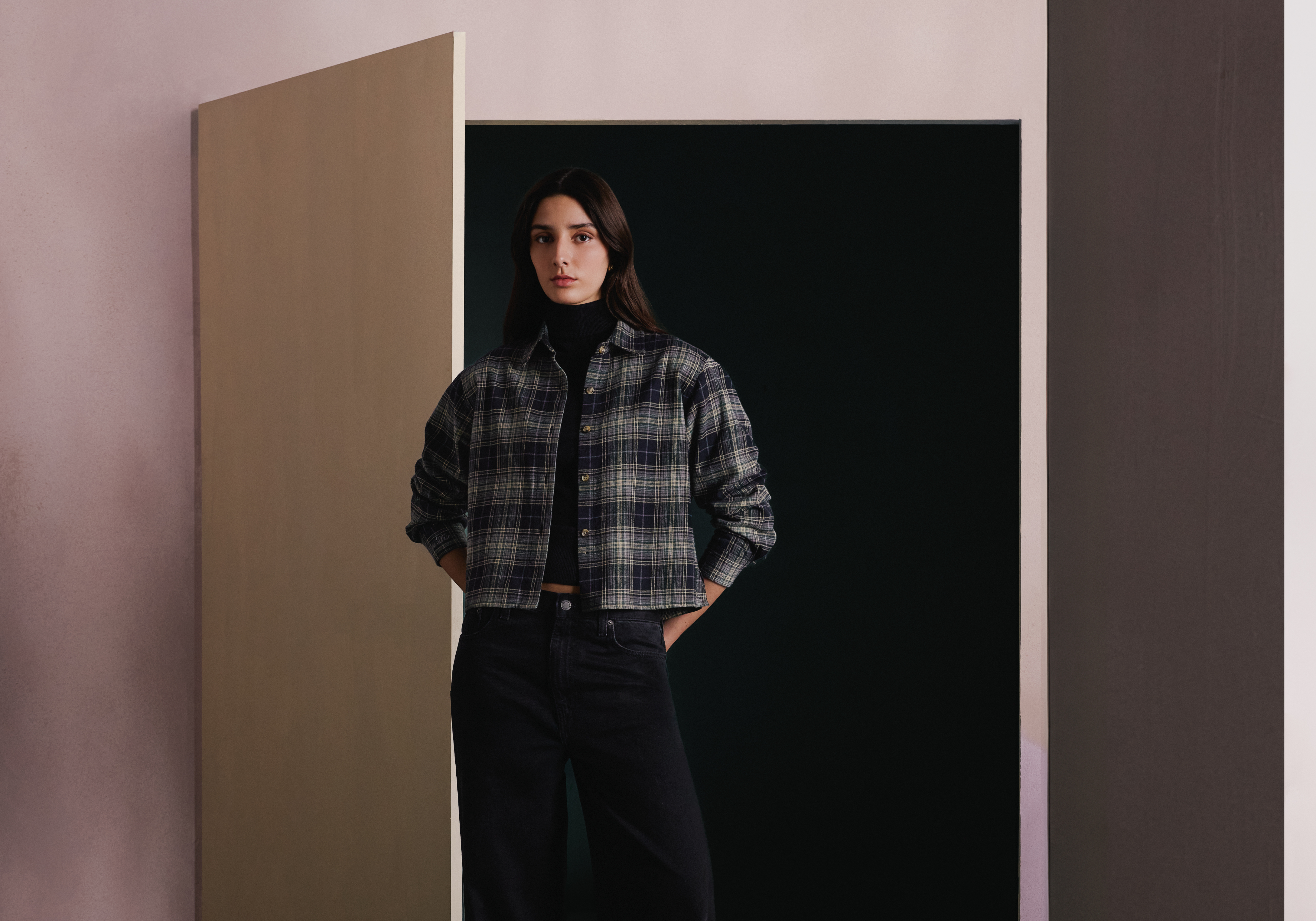 The cropped, boxed silhouette gives it structure when worn on its own, while the mid-weight flannel allows it to layer cleanly without bulk.