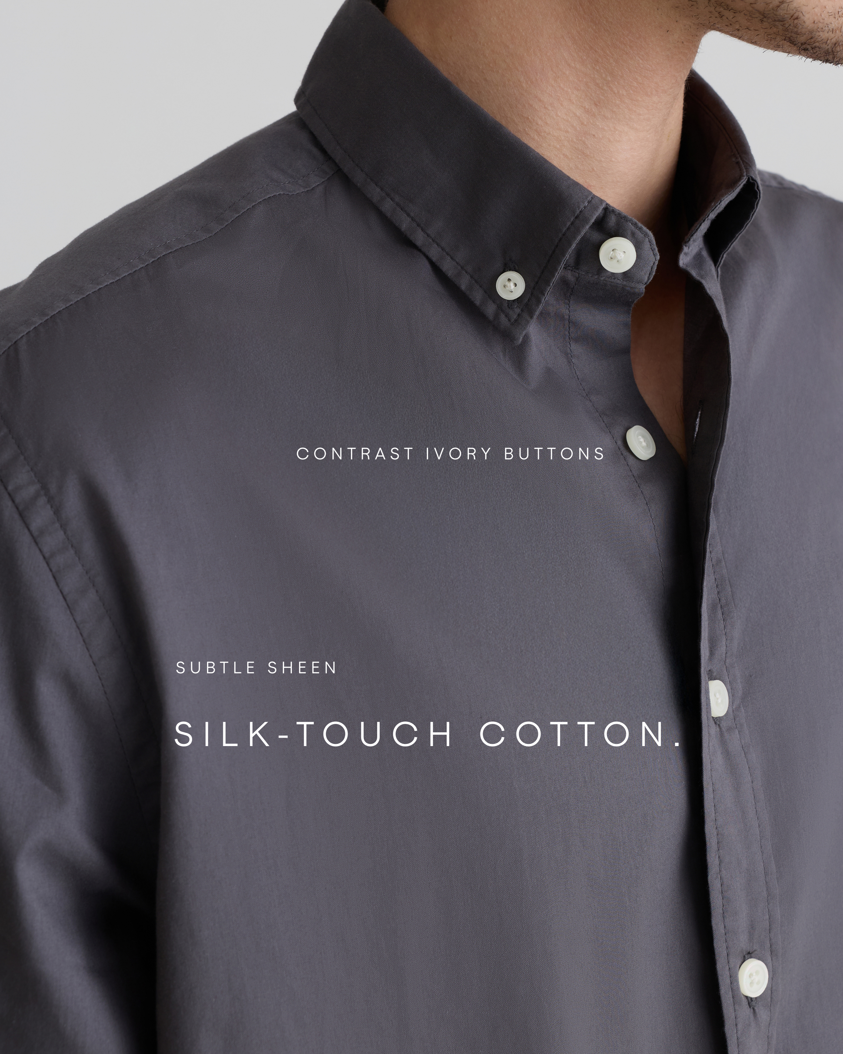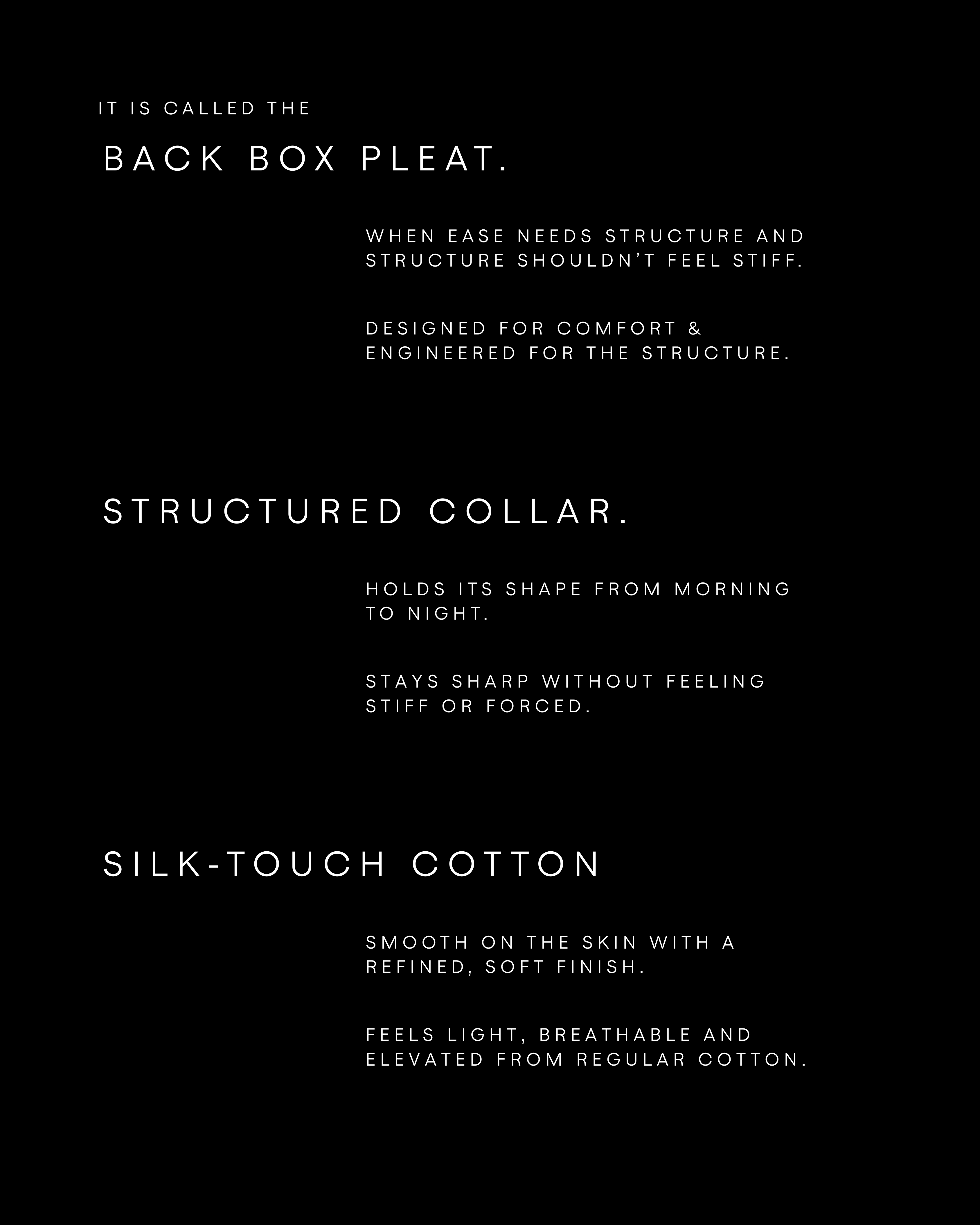 Made from silk-touch cotton with Thai silk, giving it a smooth, refined finish without stiffness. The fabric has enough structure to stay sharp when tucked in, yet remains soft and light enough to wear untucked comfortably. Lighter than typical formal solids and more polished than casual shirts, it’s designed to sit in the middle, work-ready when you need it, relaxed when you don’t.